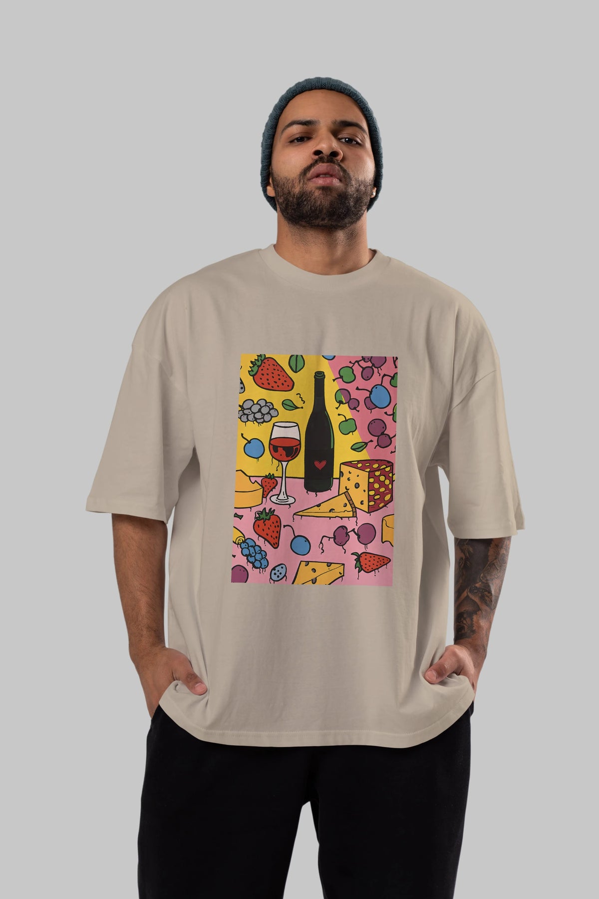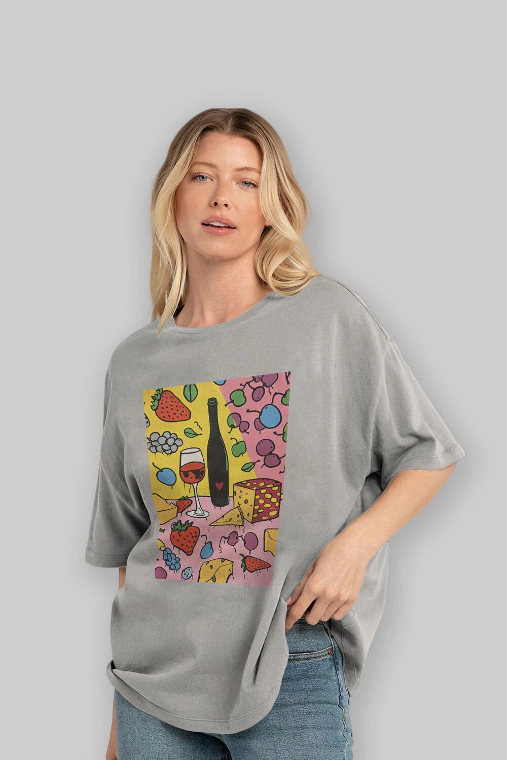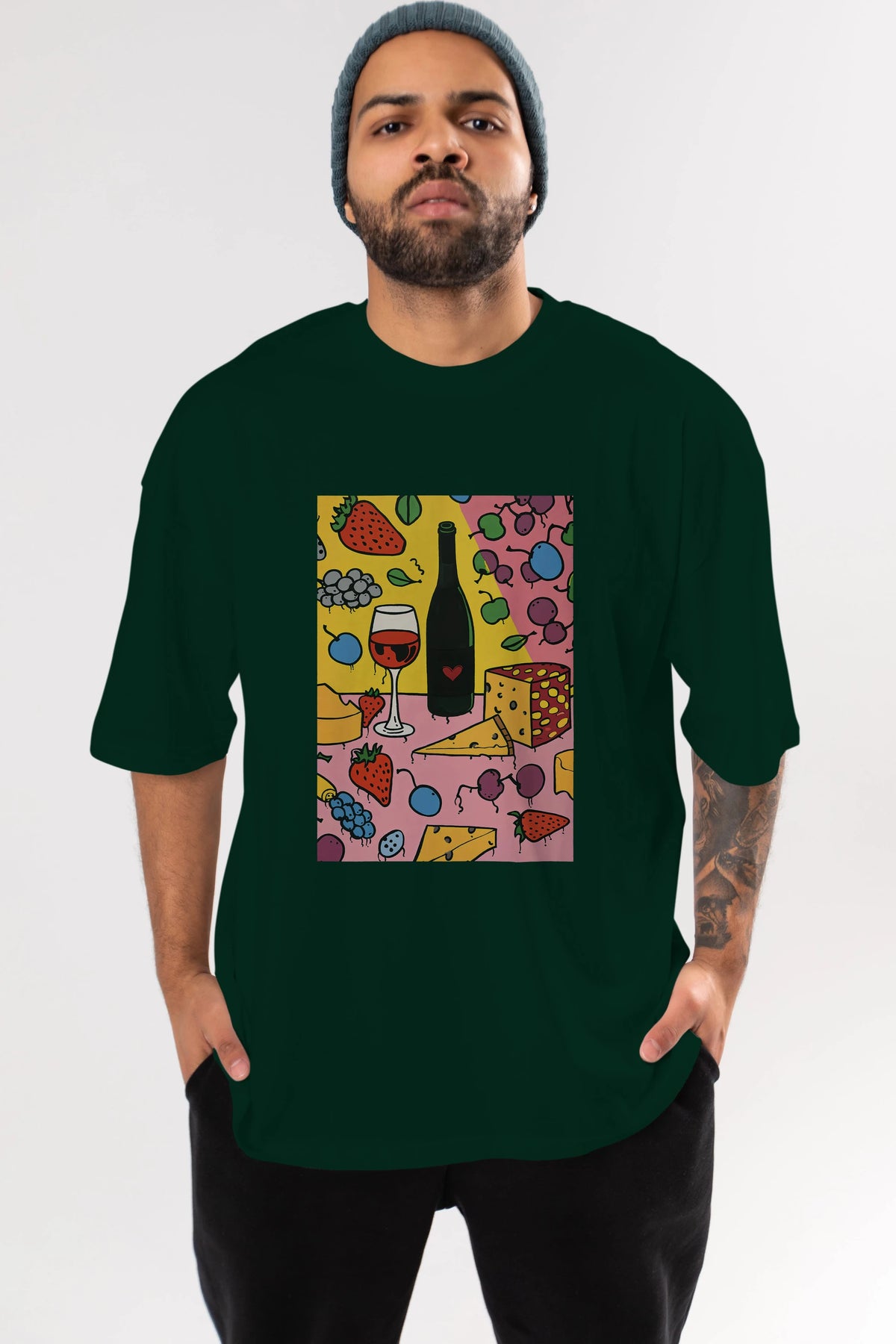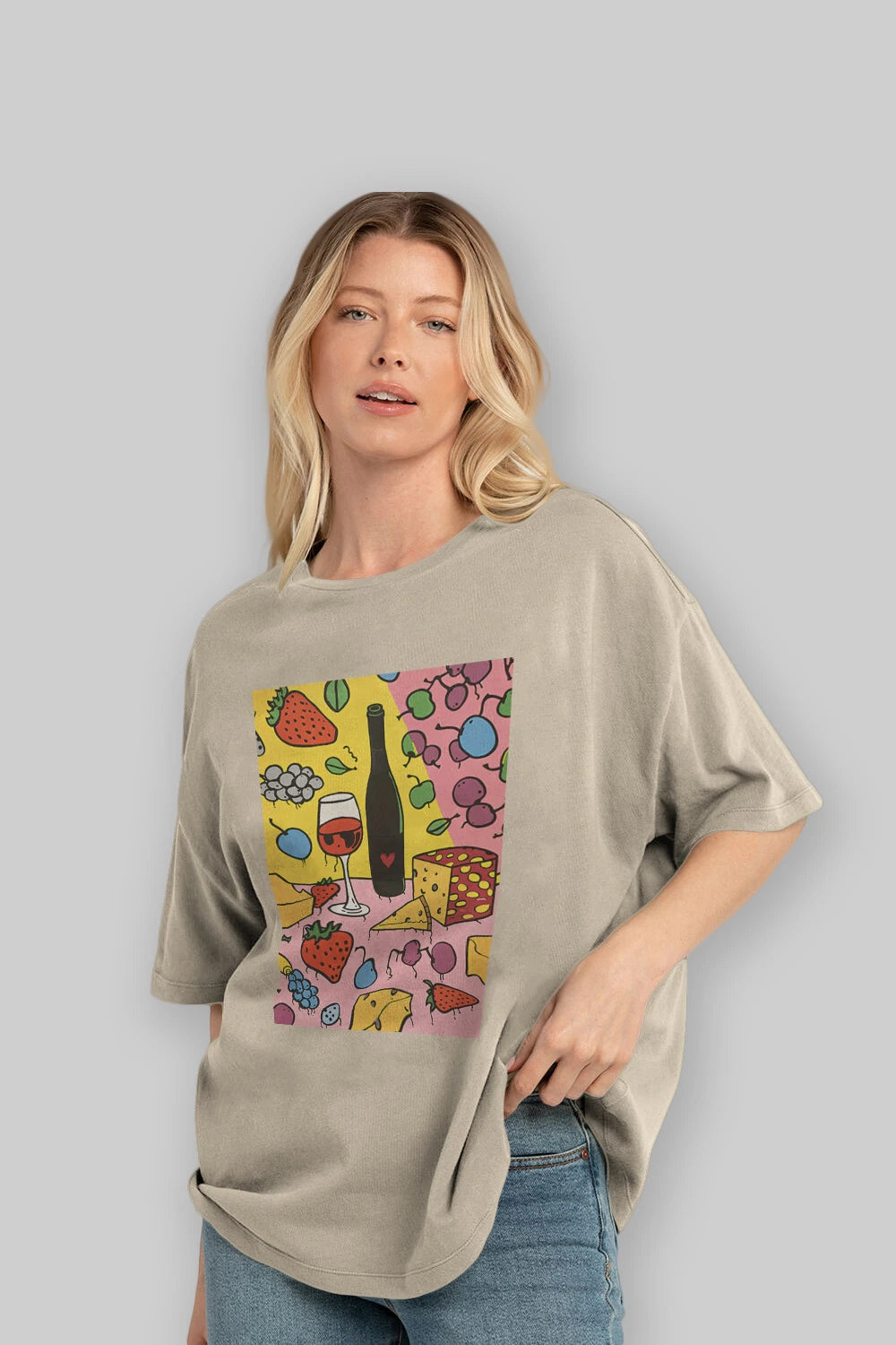 Wine Cheese Fruits Ön Baskılı Oversize t-shirt Erkek Kadın Unisex %100 Pamuk Bisiklet Yaka tişort