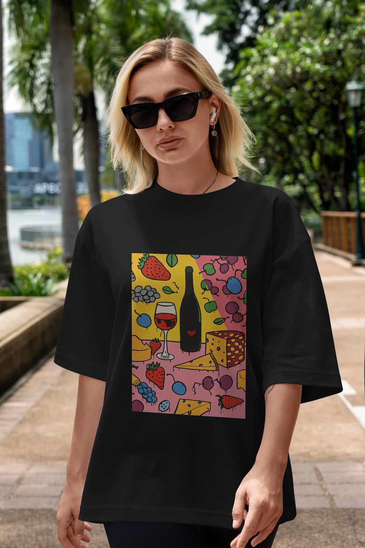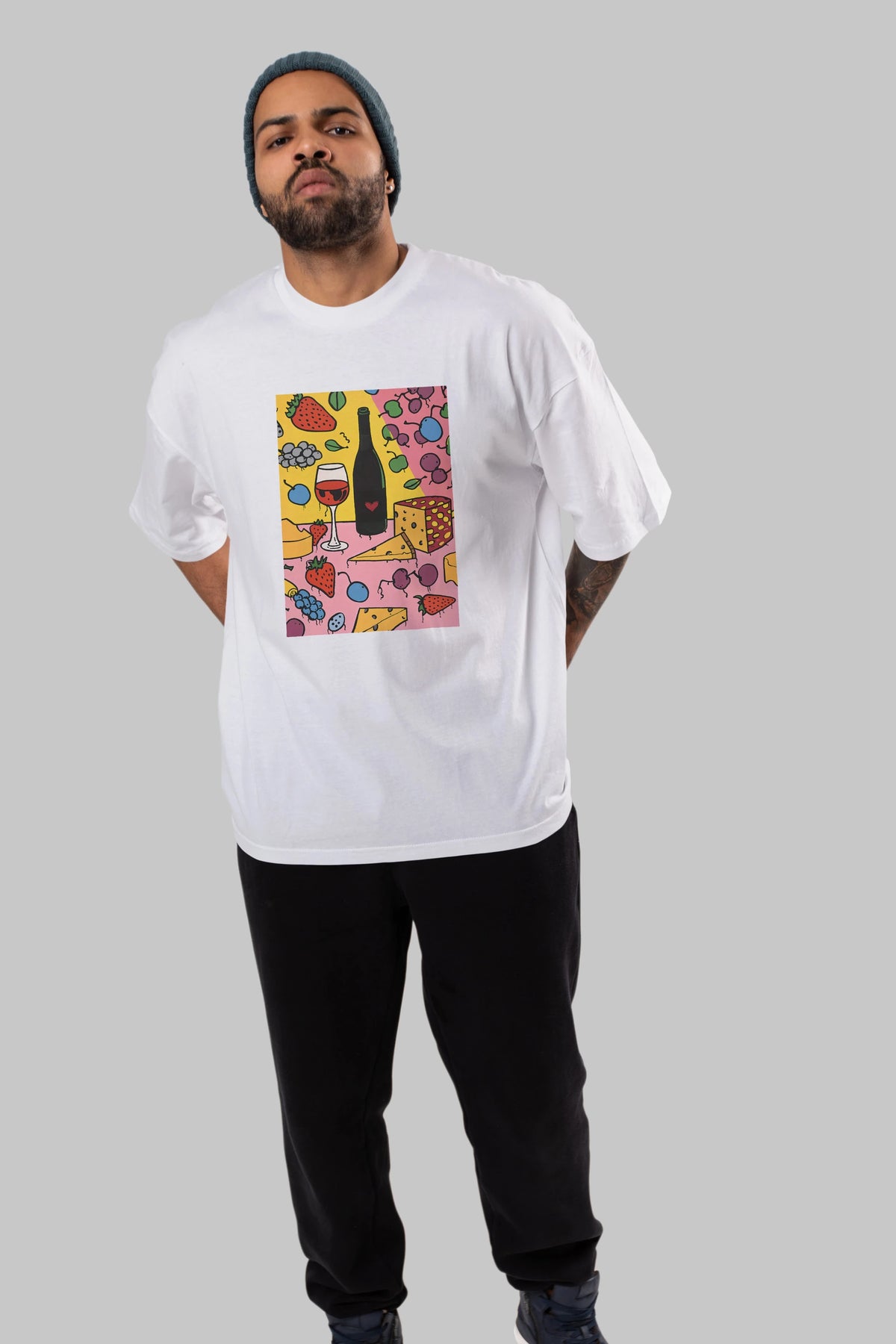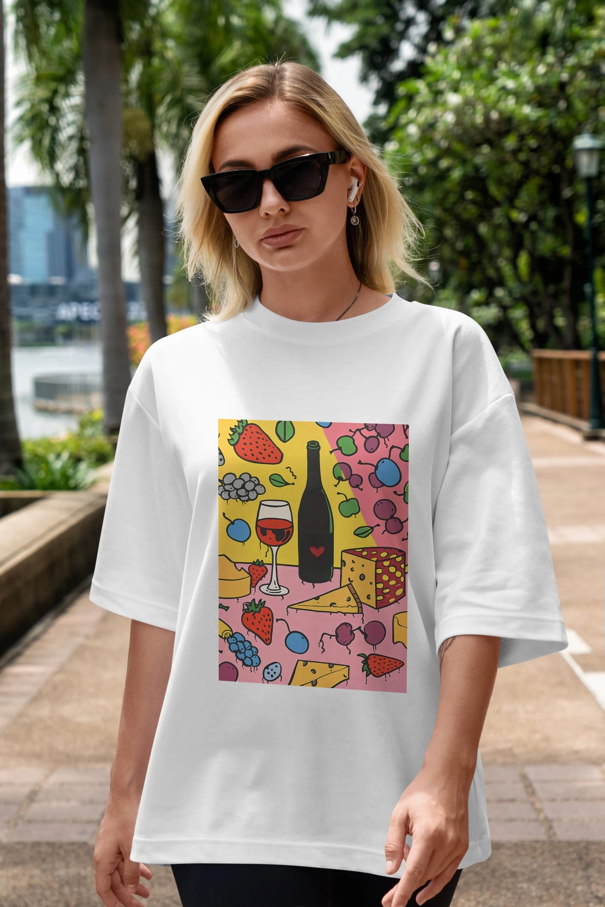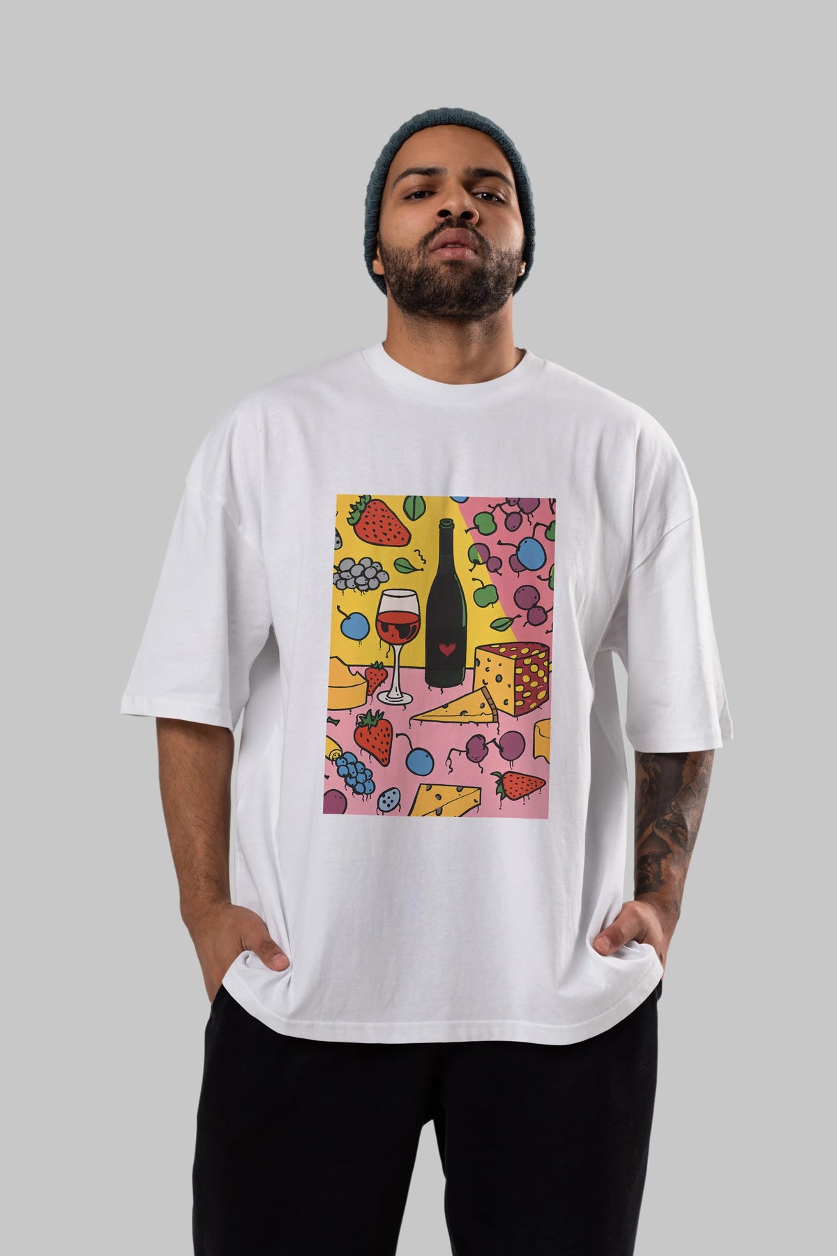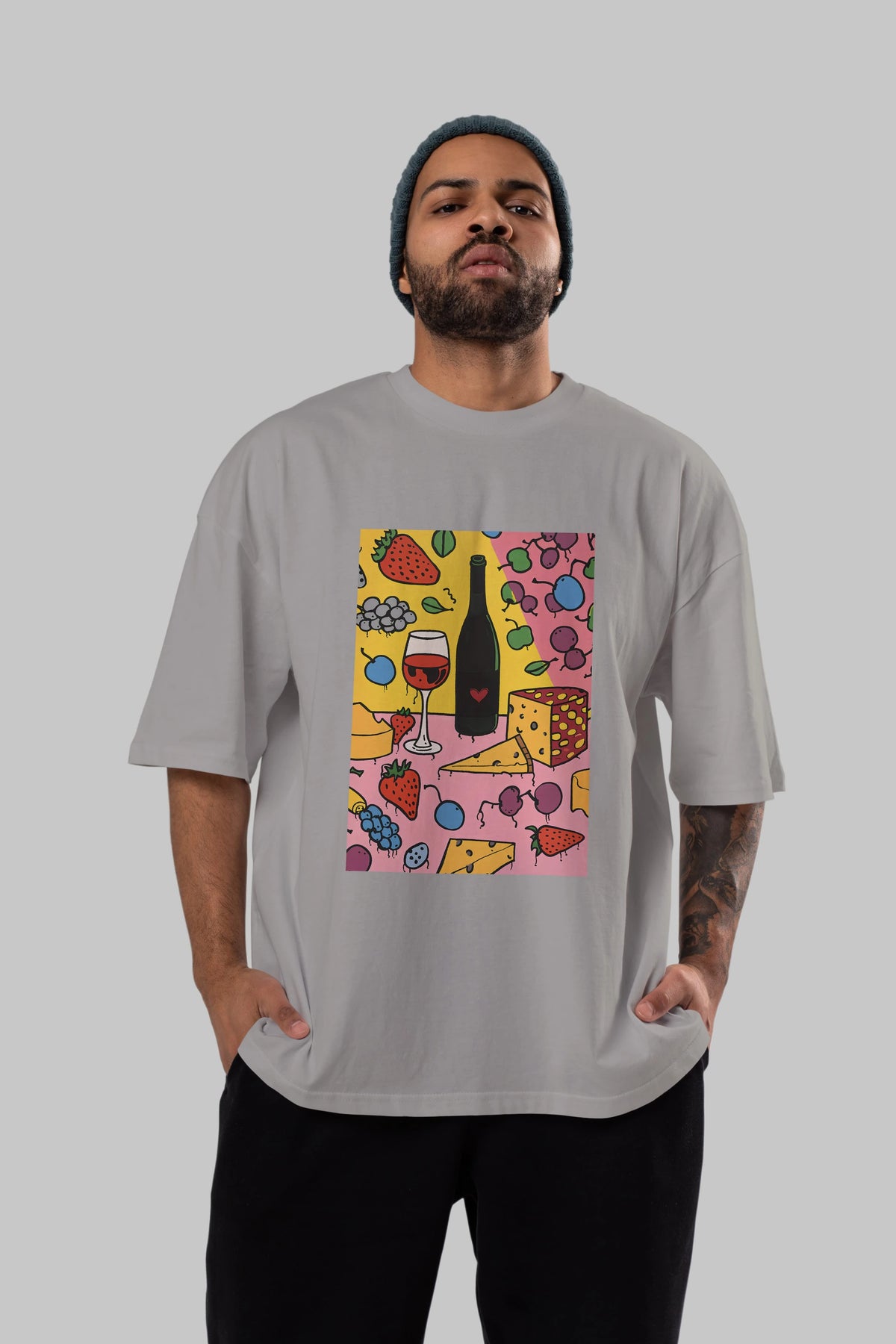 Wine Cheese Fruits Ön Baskılı Oversize t-shirt Erkek Kadın Unisex %100 Pamuk Bisiklet Yaka tişort