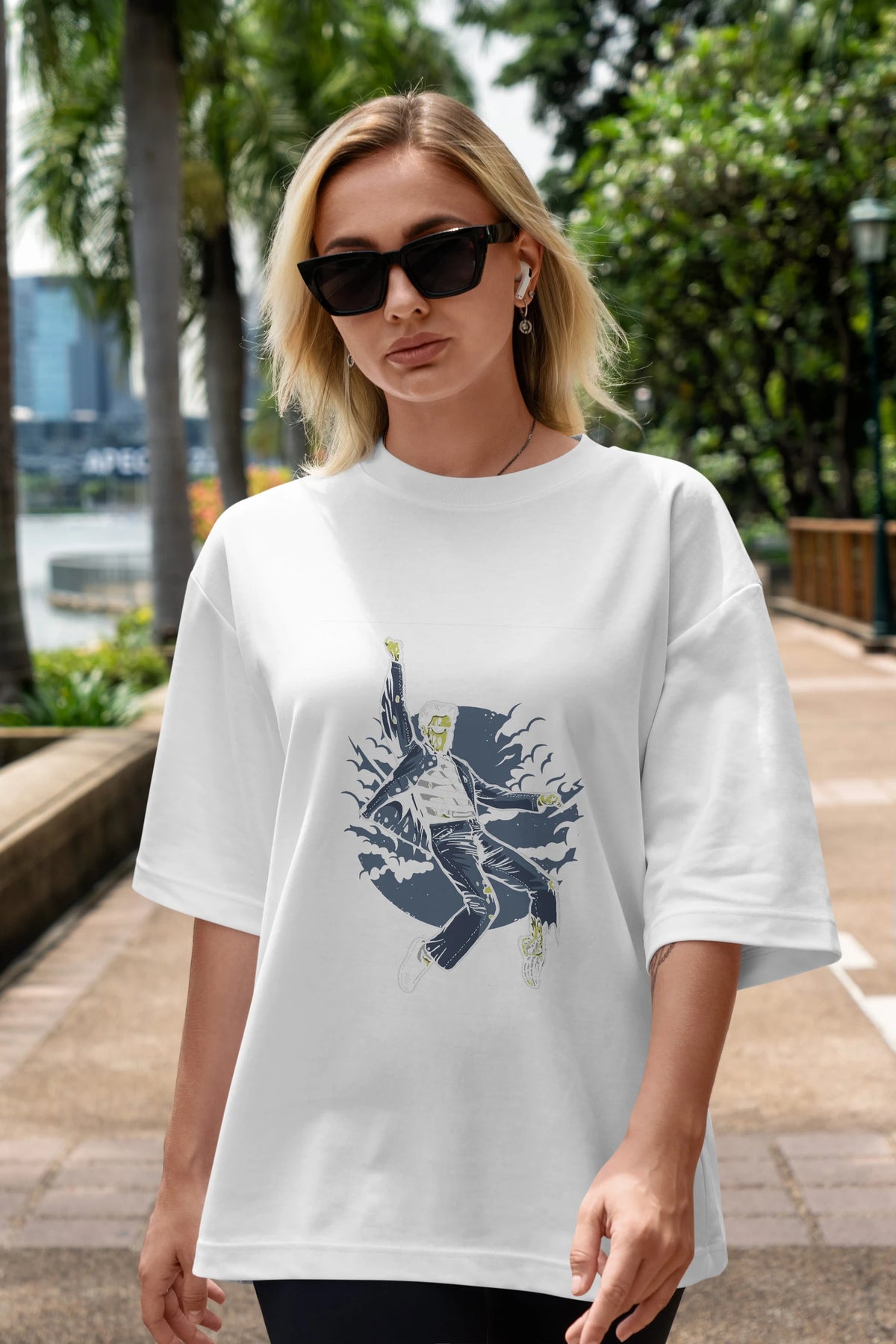 Hem erkekler hem de kadınlar için uygun, taze, modern bir baskıya sahip baskılı oversize t-shirt.